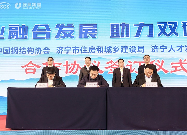 中國鋼結構協(xié)會、濟寧市住房和城鄉(xiāng)建設局、濟寧人才發(fā)展集團三方人才合作簽約儀式。