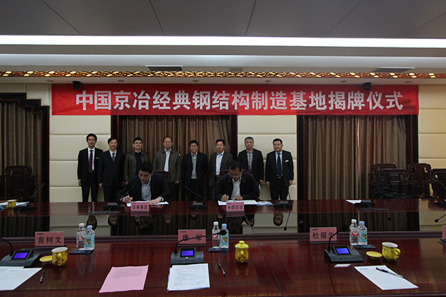 揭牌儀式前,中國京冶鋼結(jié)構(gòu)事業(yè)部常務副總經(jīng)理常好誦和經(jīng)典集團董事長苗樹文在公司三樓會議中心共同簽訂了戰(zhàn)略合作框架協(xié)議。中國京冶與經(jīng)典集團將本著平等、誠信、互惠、共贏的原則,利用各自優(yōu)勢在鋼結(jié)構(gòu)建筑領(lǐng)域建立長期戰(zhàn)略合作伙伴關(guān)系,在高層、超高層鋼結(jié)構(gòu)建筑、大跨度鋼結(jié)構(gòu)建筑、鋼結(jié)構(gòu)住宅產(chǎn)業(yè)化、鋼結(jié)構(gòu)工程設(shè)計施工制造管理、節(jié)能環(huán)保維護系統(tǒng)等領(lǐng)域開展項目工程合作、科研與技術(shù)合作。
