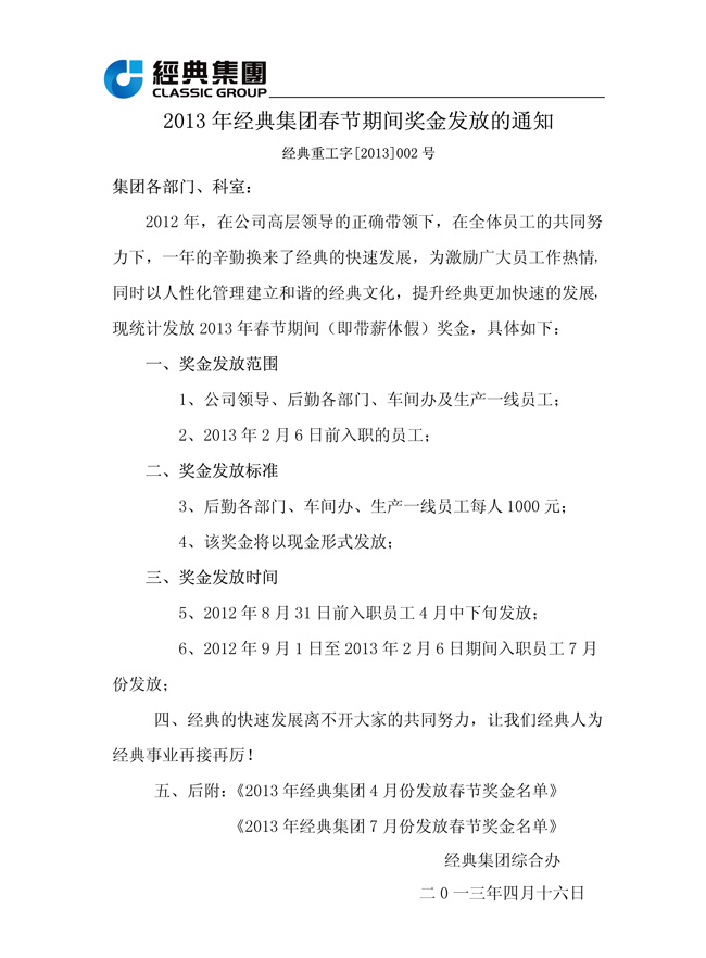 2013年經(jīng)典集團(tuán)春節(jié)期間獎金發(fā)放的通知