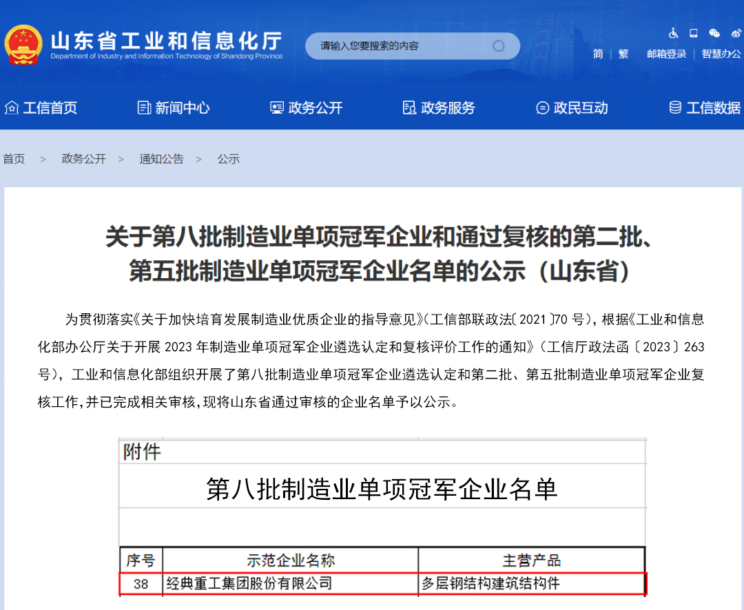 近日,工業(yè)和信息化部第八批制造業(yè)單項冠軍示范企業(yè)名單公示,經(jīng)典重工集團股份有限公司位列其中,是該榮譽歷批次認定中唯一一家建筑鋼結(jié)構(gòu)行業(yè)民營企業(yè)。