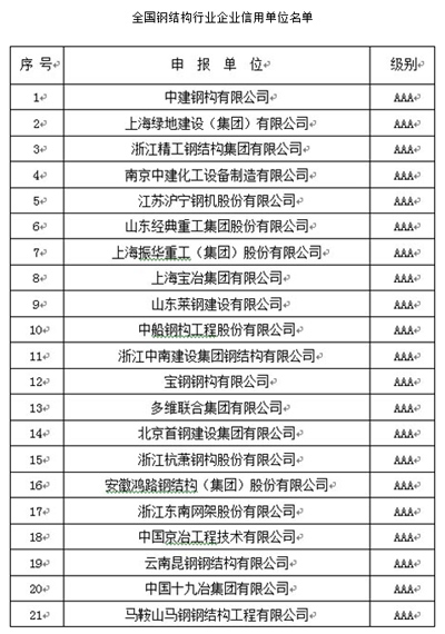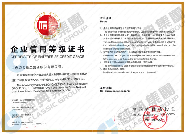 2014年10月26-27日,在南京國際會議中心隆重舉辦的中國鋼結(jié)構(gòu)協(xié)會成立三十周年紀(jì)念大會暨六屆四次理事會擴(kuò)大會議上,山東經(jīng)典重工集團(tuán)股份有限公司獲得首批全國鋼結(jié)構(gòu)行業(yè)AAA級信用企業(yè)。